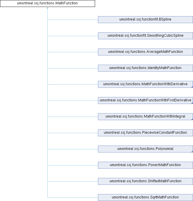Implemented in umontreal.ssj.functionfit.BSpline, umontreal.ssj.functionfit.SmoothingCubicSpline, umontreal.ssj.functions.AverageMathFunction, umontreal.ssj.functions.IdentityMathFunction, umontreal.ssj.functions.PiecewiseConstantFunction, umontreal.ssj.functions.Polynomial, umontreal.ssj.functions.PowerMathFunction, umontreal.ssj.functions.ShiftedMathFunction, umontreal.ssj.functions.SqrtMathFunction, and umontreal.ssj.functions.SquareMathFunction.